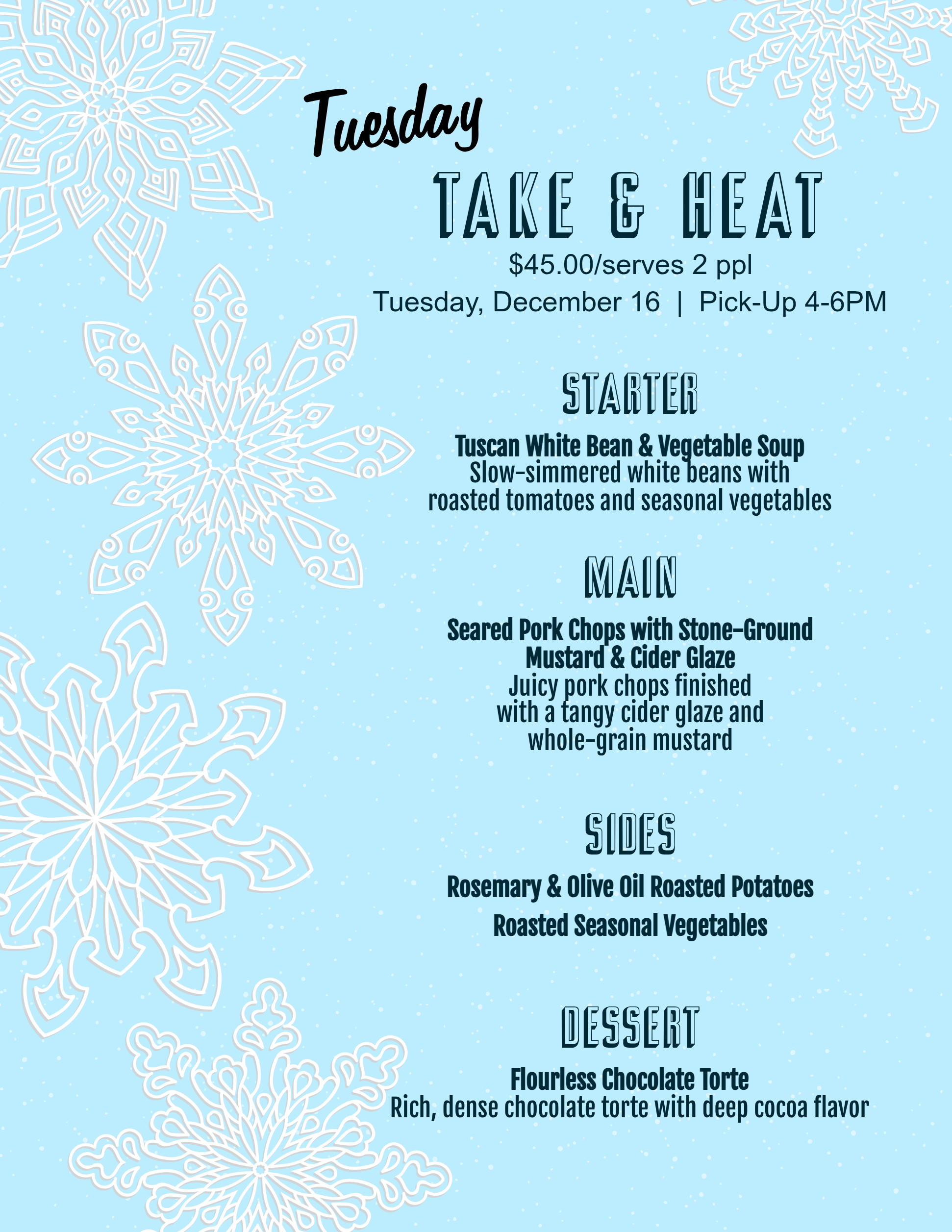 Our special Christmas Dinner Take & Heat meal is available to order online ahead, with pick-up the day before on Wednesday, Dec. 24th between 12pm and 4pm.