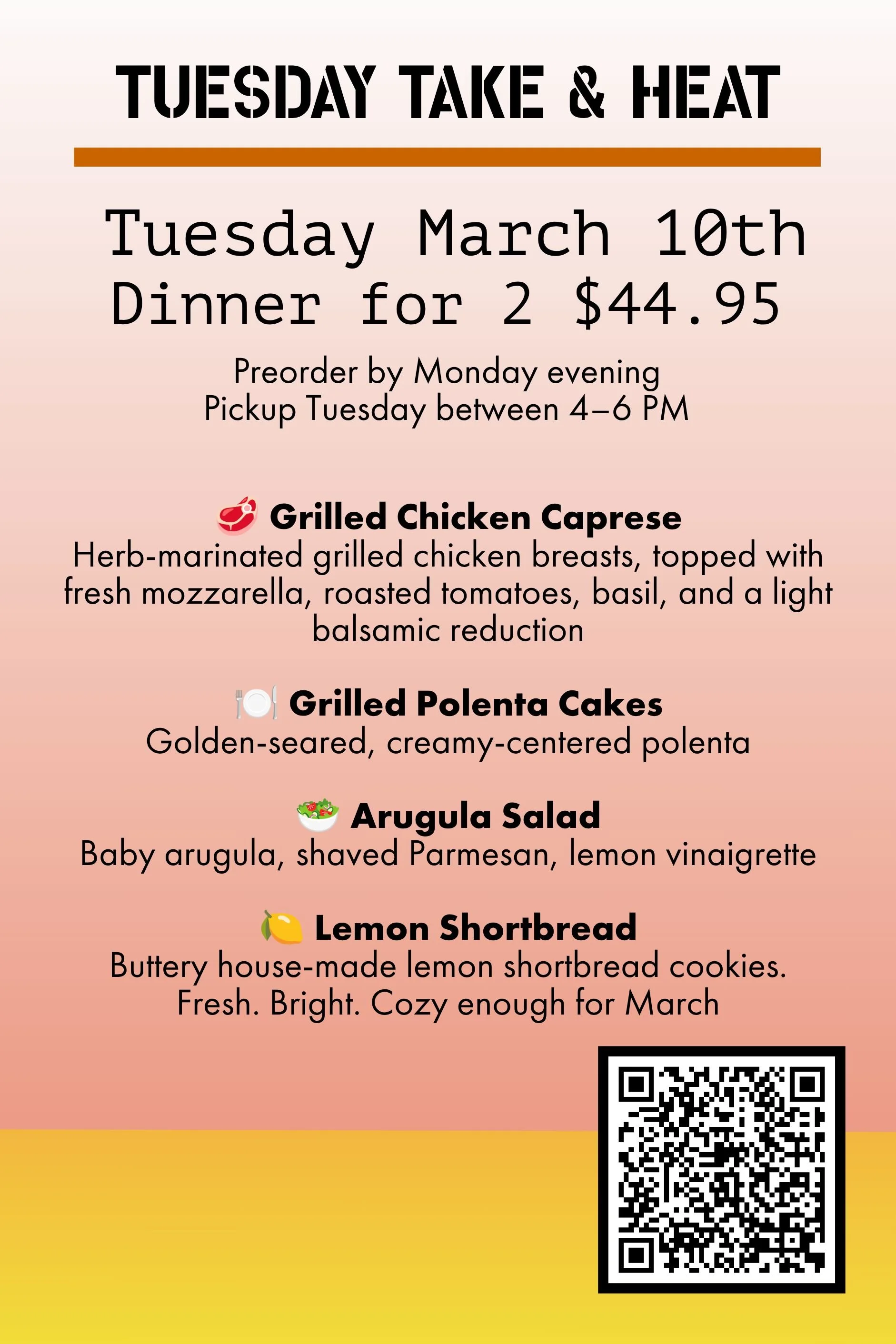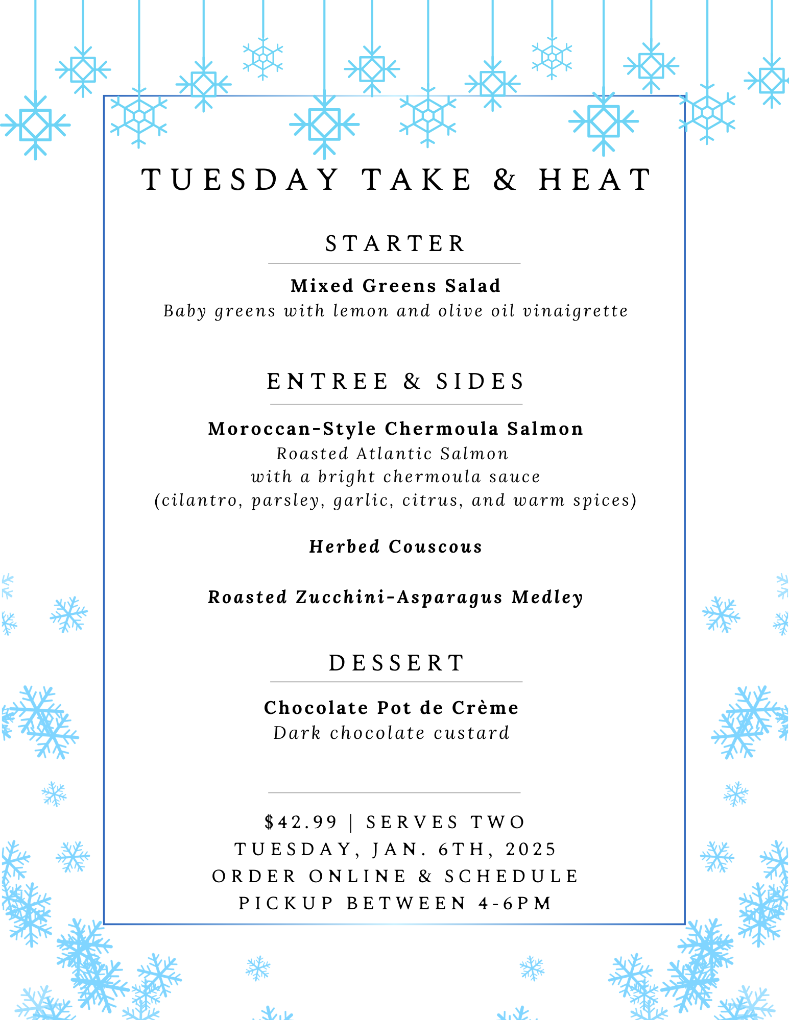 Every Tuesday, we aim to make your life a little easier by cooking for you! Easy 3-course meals that are fully prepared, chilled, and ready to pick-up and re-heat at home.